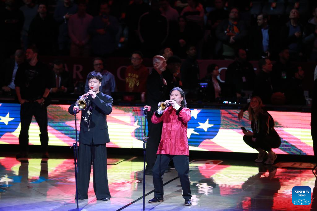 Guo Yazhi (R, Front), a renowned suona player at the Bard College Conservatory of Music, and his student Chen Xiaowen (L, Front) perform prior to tip-off of the Chinese New Year celebration game at Barclays Center in New York, the United States, on Jan. 27, 2025. Brooklyn Nets, the basketball team based in the New York City borough of Brooklyn, presented its yearly Chinese New Year celebration game Monday night playing against the Sacramento Kings. (Xinhua/Liu Yanan)
