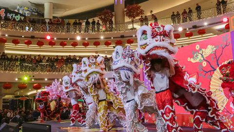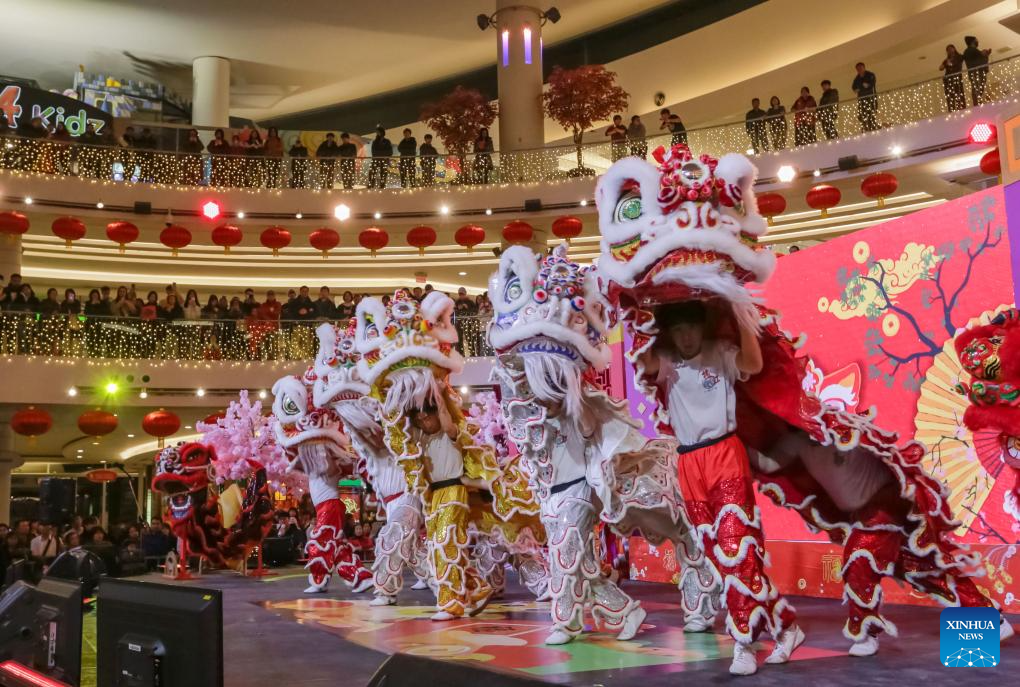 People watch a lion dance performance during the Chinese New Year countdown event for the Year of the Snake at Aberdeen Center in Richmond, British Columbia, Canada, Jan. 28, 2025. Nearly a thousand people participated in the Chinese New Year countdown event at a shopping mall, featuring festive performances to mark the beginning of the Year of the Snake. (Photo by Liang Sen/Xinhua)