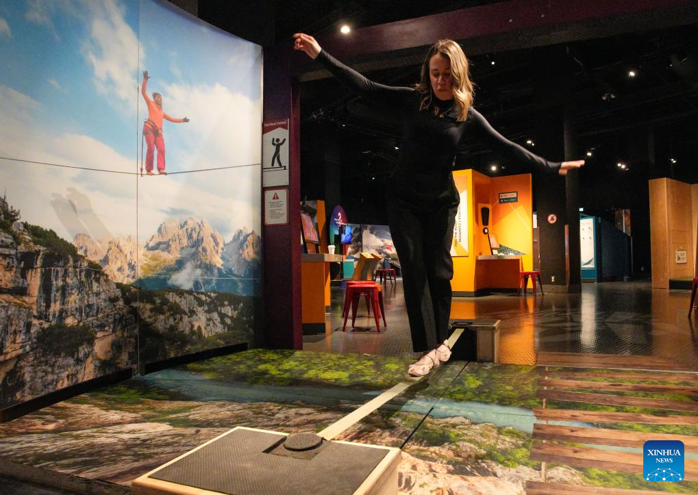 A woman tries out slacklining during a media preview of the "Extreme Sports: Beyond Human Limits" exhibition in Vancouver, British Columbia, Canada, on Jan. 30, 2025. Showcasing some of the most extreme sports in the world, including mountain climbing, skydiving, and deep-sea diving, the exhibition runs from Jan. 31 to May 19, 2025. (Photo by Liang Sen/Xinhua)