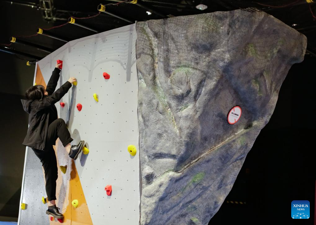 A woman tries out rock climbing during a media preview of the "Extreme Sports: Beyond Human Limits" exhibition in Vancouver, British Columbia, Canada, on Jan. 30, 2025. Showcasing some of the most extreme sports in the world, including mountain climbing, skydiving, and deep-sea diving, the exhibition runs from Jan. 31 to May 19, 2025. (Photo by Liang Sen/Xinhua)