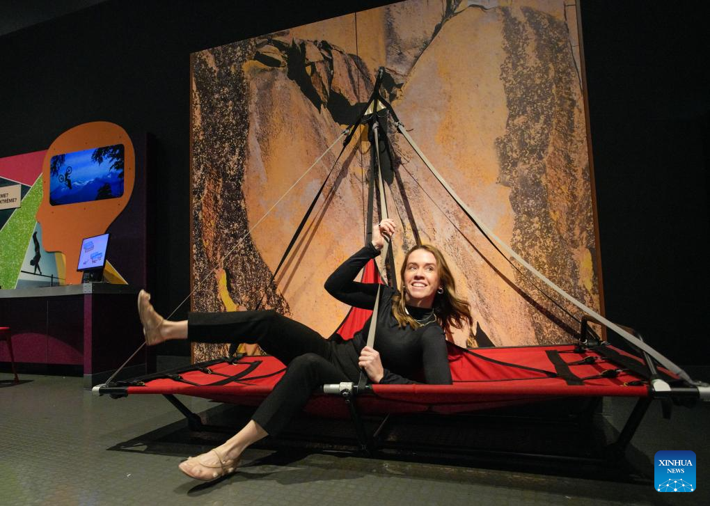 A woman tries out a sleeping pad used in rock climbing during a media preview of the "Extreme Sports: Beyond Human Limits" exhibition in Vancouver, British Columbia, Canada, on Jan. 30, 2025. Showcasing some of the most extreme sports in the world, including mountain climbing, skydiving, and deep-sea diving, the exhibition runs from Jan. 31 to May 19, 2025. (Photo by Liang Sen/Xinhua)
