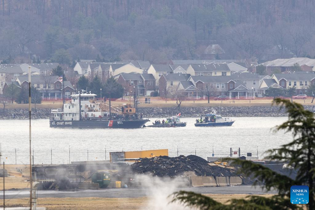 Search efforts are underway at the wreckage site of a fatal midair collision between an American Airlines plane and a military helicopter in the Potomac River near Ronald Reagan Washington National Airport, Arlington, Virginia, the United States, Jan. 31, 2025. U.S. President Donald Trump said on social media Friday that the Black Hawk helicopter was "flying too high" when it collided with a passenger jet that was approaching the runway at the Reagan National Airport Wednesday night. (Xinhua/Hu Yousong)
