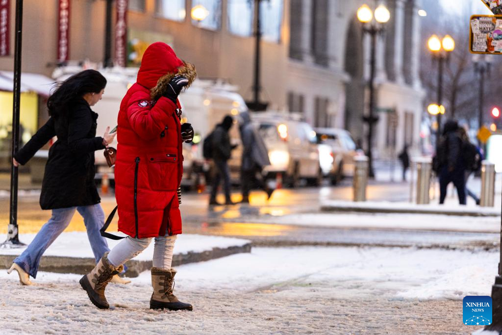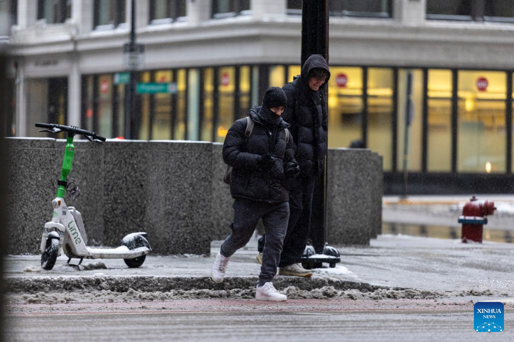 People walk amid cold wind in Chicago, the United States, on Feb. 12, 2025. Chicago is bracing for its first major winter storm of the season as moderate to heavy snow blanketed the U.S. third largest metropolitan city Wednesday.