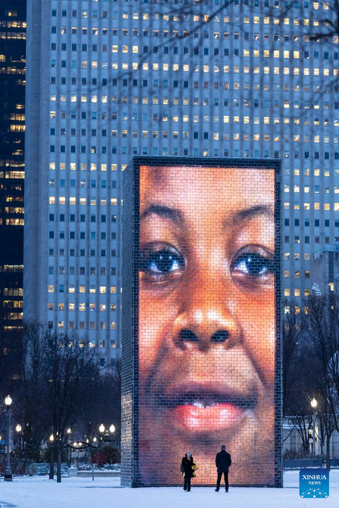 A couple is pictured near Crown Fountain in Millennium Park after a snowfall in Chicago, the United States, on Feb. 12, 2025. Chicago is bracing for its first major winter storm of the season as moderate to heavy snow blanketed the U.S. third largest metropolitan city Wednesday.