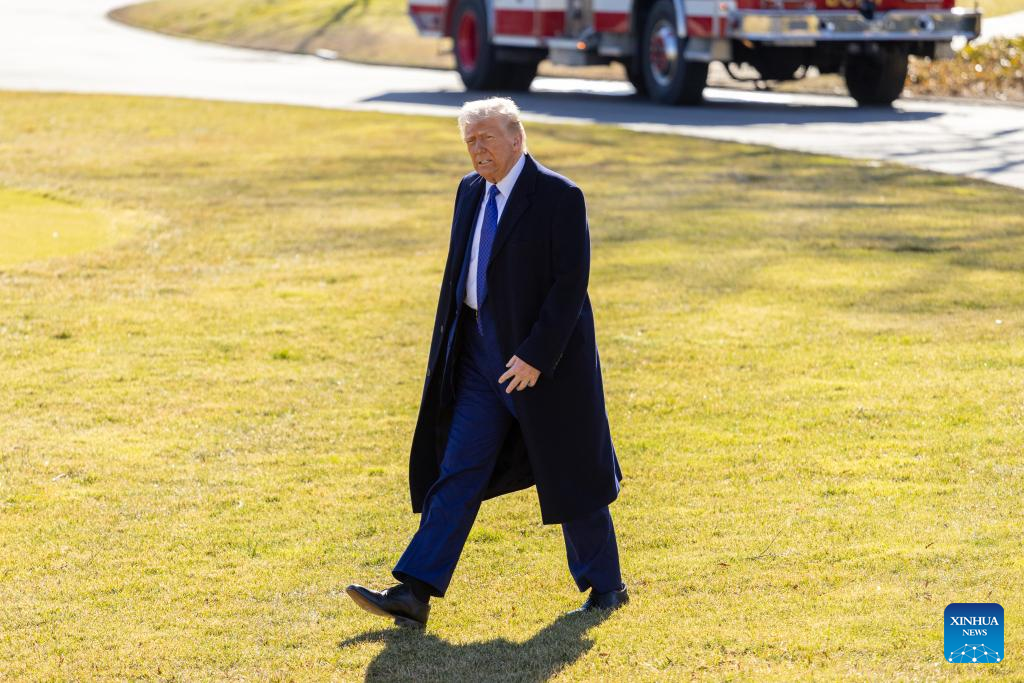 U.S. President Donald Trump walks on the South Lawn to board Marine One at the White House in Washington, D.C., the United States, Feb. 14, 2025. Trump signed an executive order Friday on establishing a new council to boost U.S. production and export of fossil fuels.