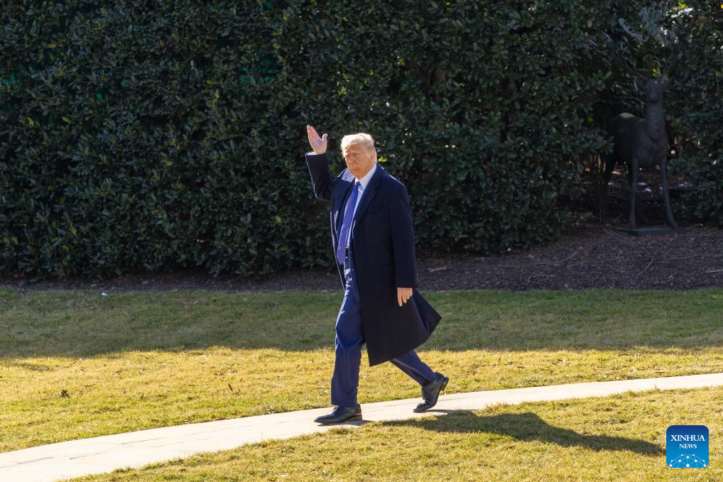 U.S. President Donald Trump waves as he walks on the South Lawn to board Marine One at the White House in Washington, D.C., the United States, Feb. 14, 2025. Trump signed an executive order Friday on establishing a new council to boost U.S. production and export of fossil fuels. Tasked with driving up U.S. domestic oil and gas production, partly for export, the National Energy Dominance Council will be chaired by Secretary of the Interior Doug Burgum. (Xinhua/Hu Yousong)