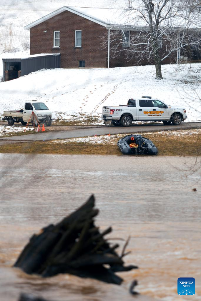 A rescue vehicle is seen at the flooded area in Hart County, Kentucky, the United States, Feb. 16, 2025. (Photo by Austin Anthony/Xinhua)