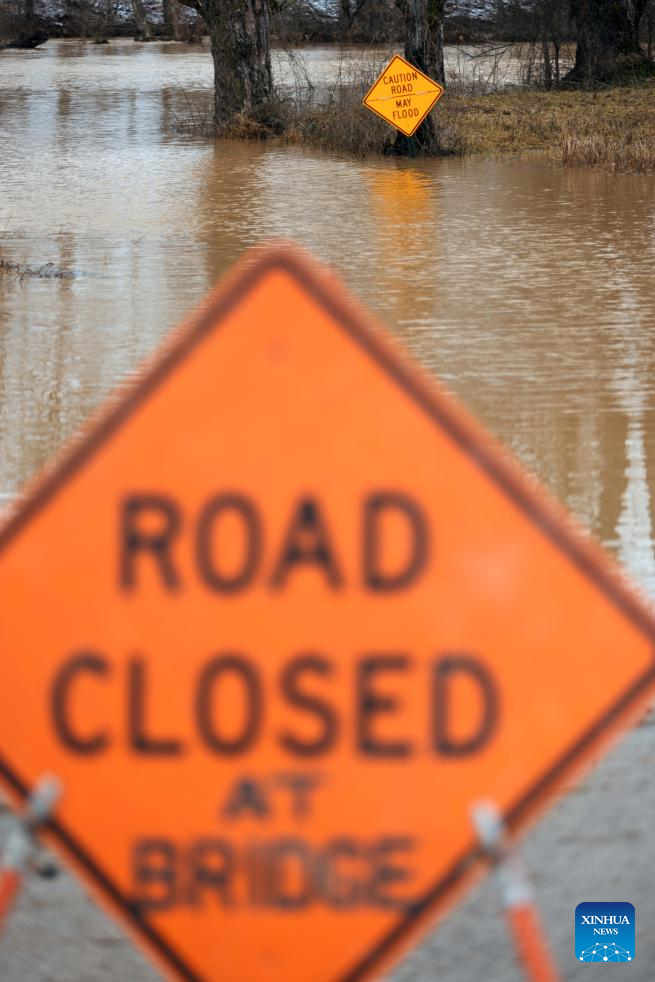 A road ends in flood in Hart County, Kentucky, the United States, Feb. 16, 2025. (Photo by Austin Anthony/Xinhua)