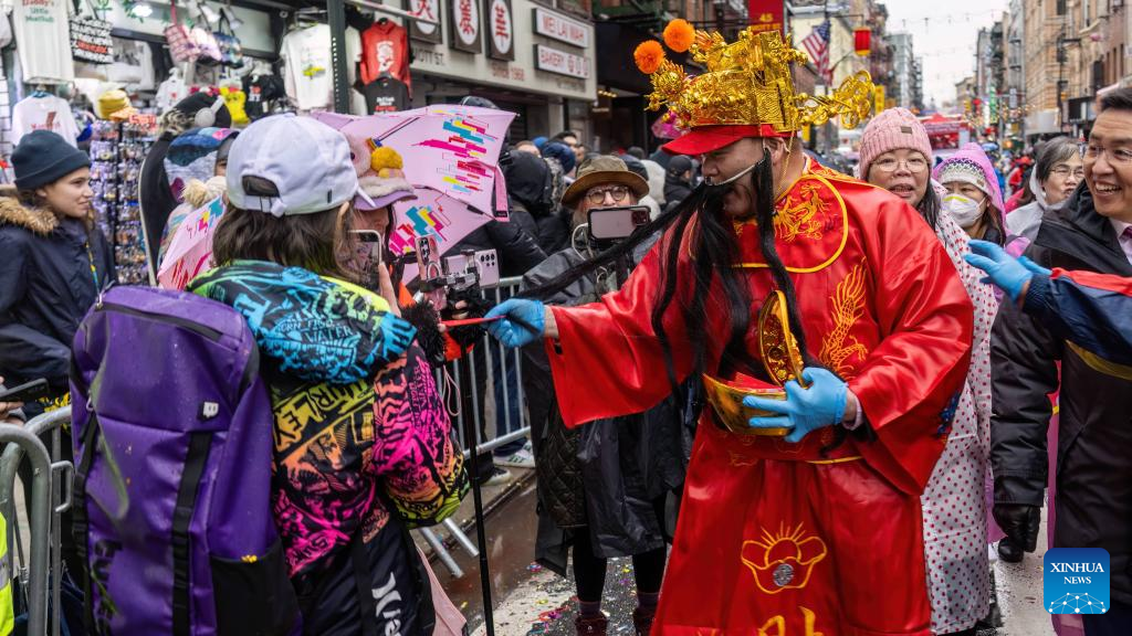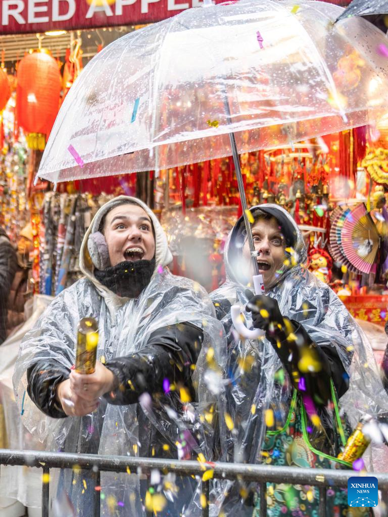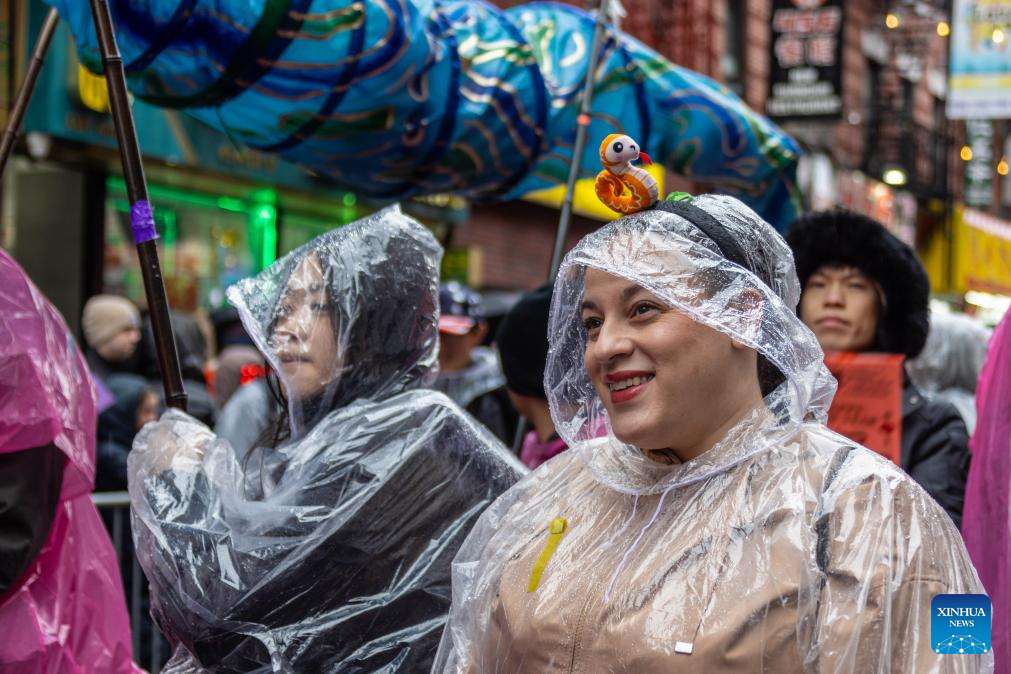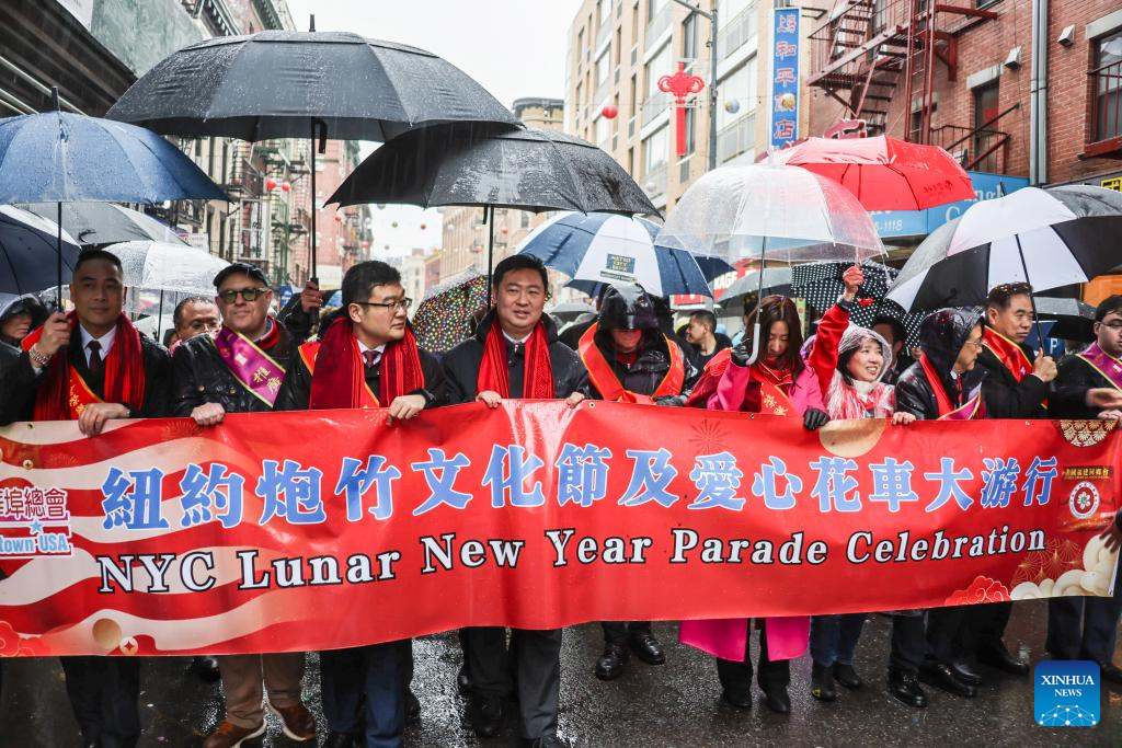 NEW YORK, Feb. 16 (Xinhua) -- The 27th Lunar New Year parade and festival returned to Chinatown in Lower Manhattan, New York City, on Sunday despite unusual downpours.