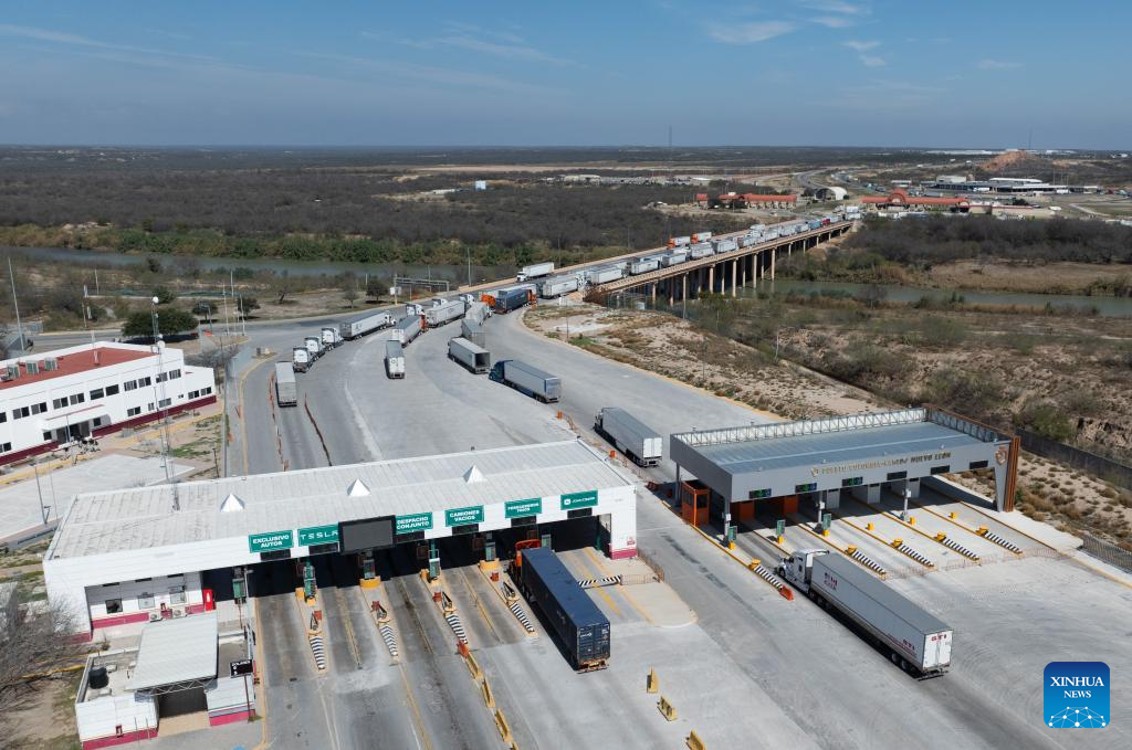 An aerial drone photo taken on Feb. 16, 2025 in Nuevo Laredo, Tamaulipas, Mexico shows an international bridge between Mexico (front) and the United States.
