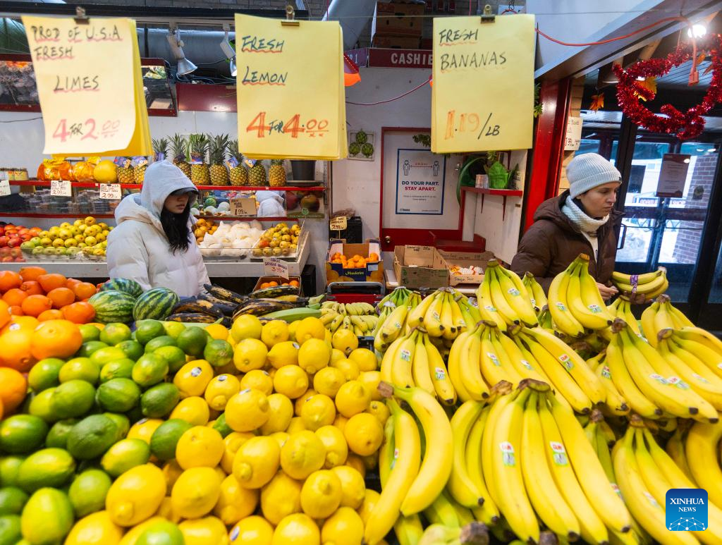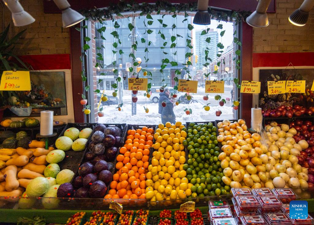 Customers shop for fruits at a market in Toronto, Canada, on Feb. 18, 2025. (Photo by Zou Zheng/Xinhua)