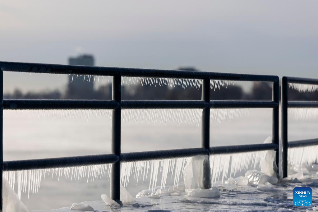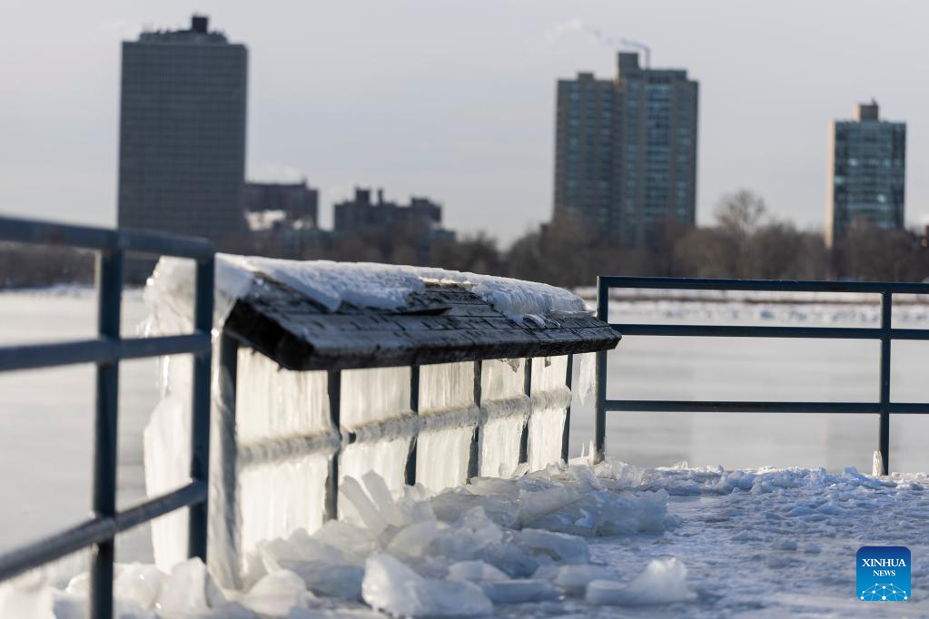 A pier on Lake Michigan is covered with ice in Chicago, the United States, on Feb. 18, 2025. (Photo by Vincent D. Johnson/Xinhua)
