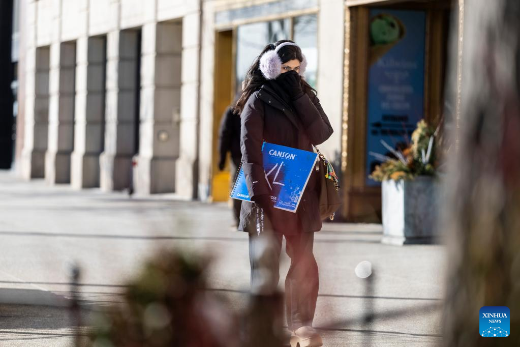 An art student covers her face from the bitter cold on a street in Chicago, the United States, on Feb. 18, 2025. (Photo by Vincent D. Johnson/Xinhua)