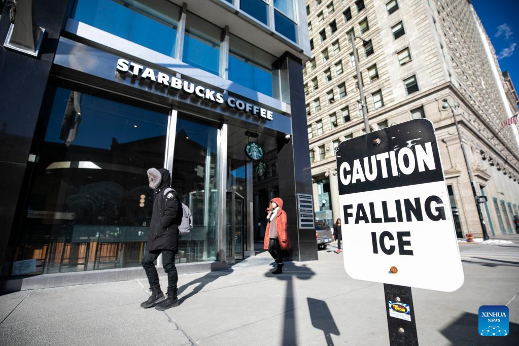 A sign warning of potential falling ice stands outside a building in Chicago, the United States, on Feb. 18, 2025. (Photo by Vincent D. Johnson/Xinhua)
