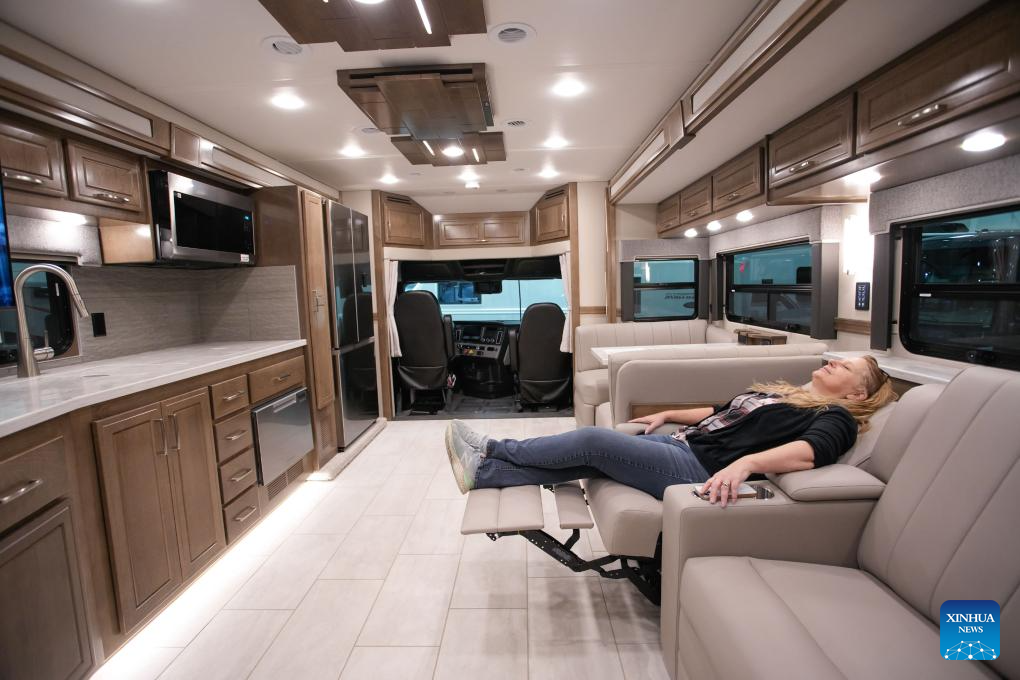 A woman tries facilities inside a luxury RV at the 2025 Earlybird RV Show and Sale in Abbotsford, British Columbia, Canada, Feb. 20, 2025. Featuring over 200 recreational vehicles (RVs) from 45 exhibitors across North America, this annual event is held here from Feb. 20 to Feb. 23. (Photo by Liang Sen/Xinhua)