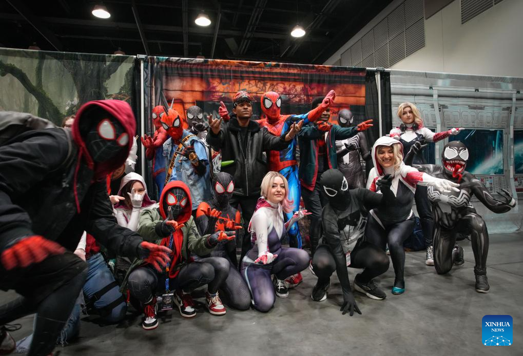 Cosplayers dressed as different versions of Spider-Man characters pose for photos at a Spider-Man meetup event during the 2025 Fan Expo in Vancouver, British Columbia, Canada, Feb. 23, 2025. (Photo by Liang Sen/Xinhua)