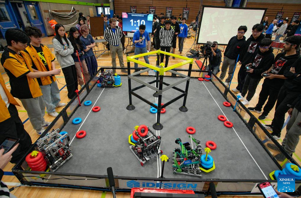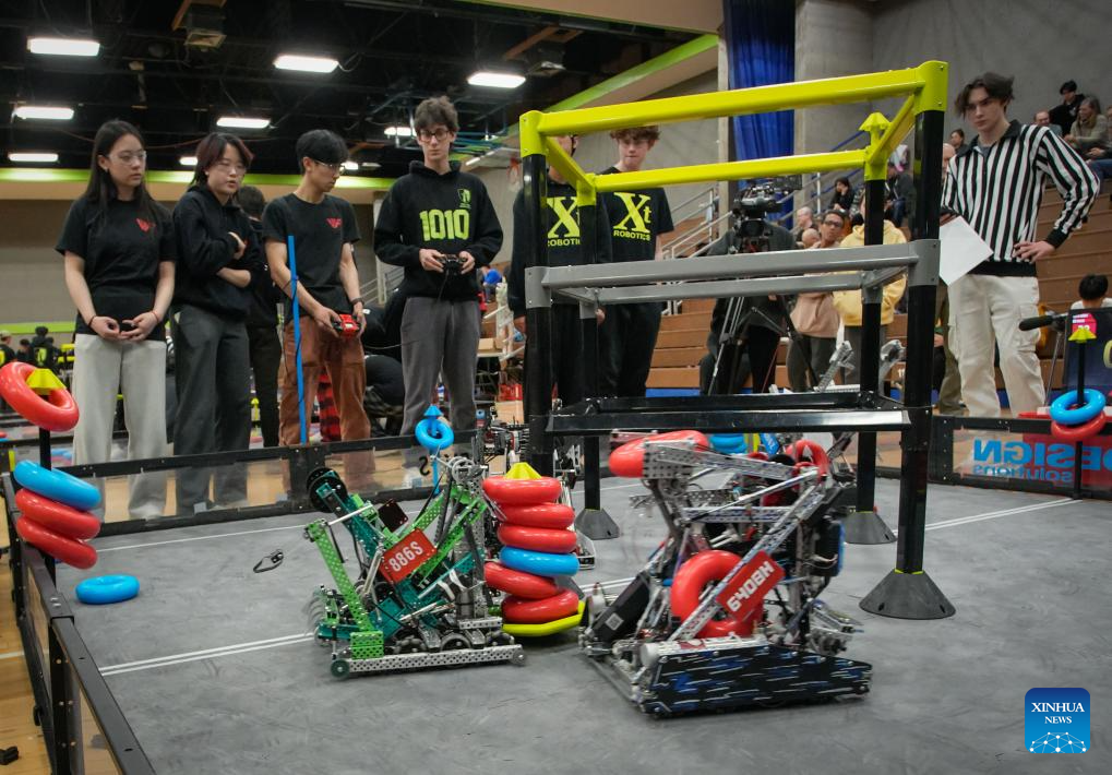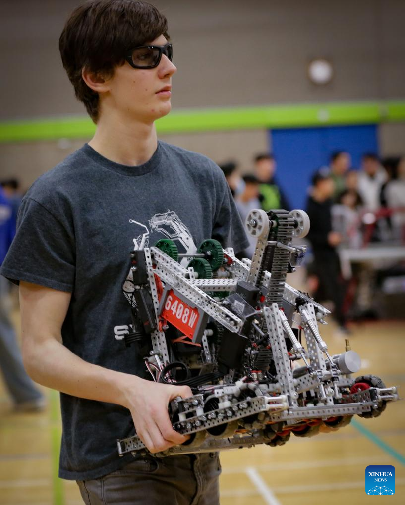 Hundreds of high school students teamed up to compete in the competition here on Saturday, and winners will advance to the VEX Robotics World Championship in Dallas, United States, in May 2025. (Photo by Liang Sen/Xinhua)