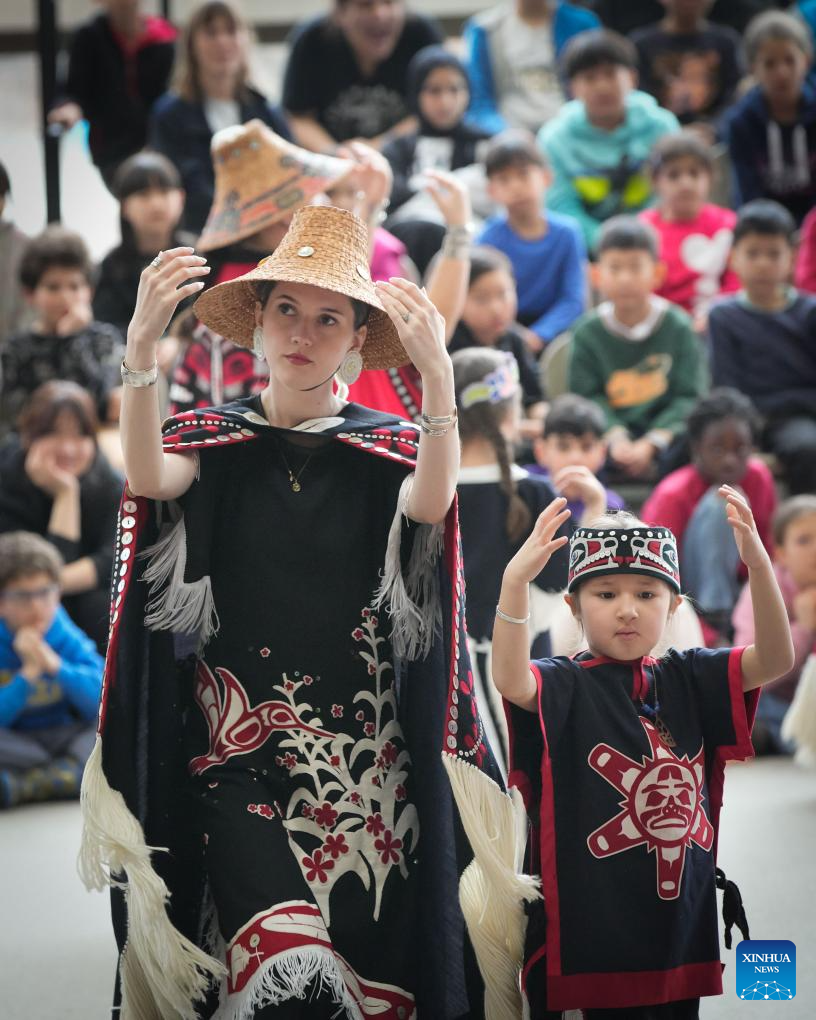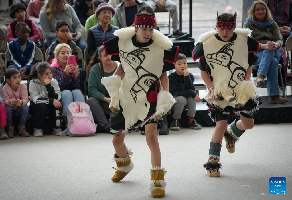 Dancers perform an indigenous dance at the 18th Annual Coastal Dance Festival, held at the Museum of Anthropology in Vancouver, British Columbia, Canada, March 4, 2025. (Photo by Liang Sen/Xinhua)