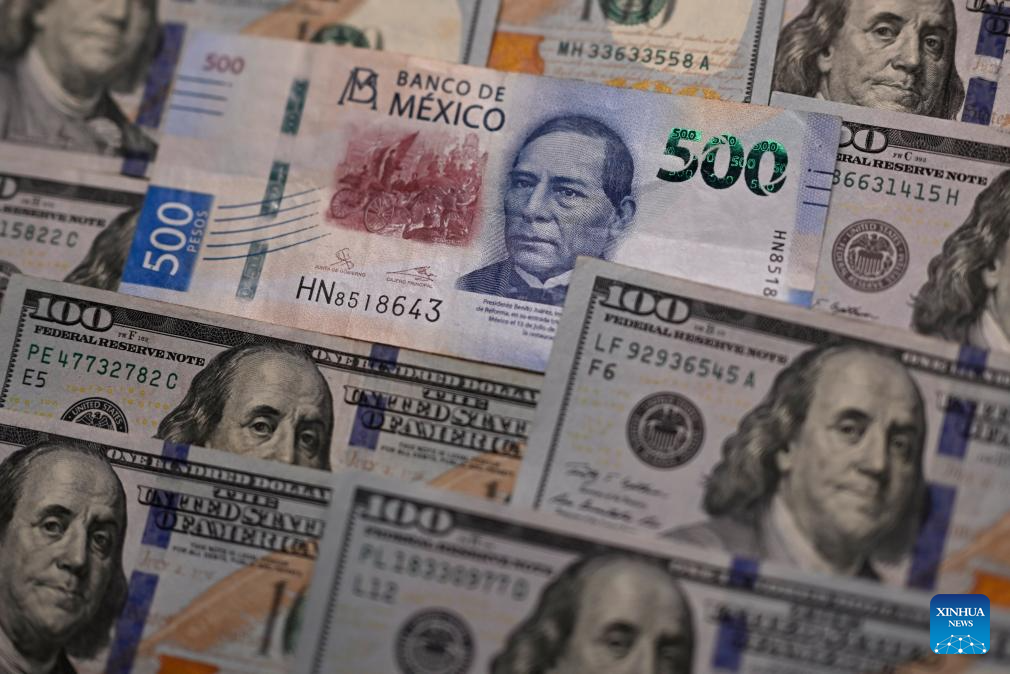 A five-hundred Mexican peso banknote is pictured with one-hundred U.S. dollar bills in Mexico City, Mexico, March 4, 2025. The 25-percent U.S. tariffs, which took effect at midnight between Monday and Tuesday, have already impacted Mexico's financial markets. The Mexican peso depreciated nearly 1 percent on Tuesday, reaching 20.90 per U.S. dollar in interbank trading. Analysts attribute the decline to concerns over escalating trade tensions, warning that further U.S. tariff hikes could follow. (Xinhua/Li Muzi)