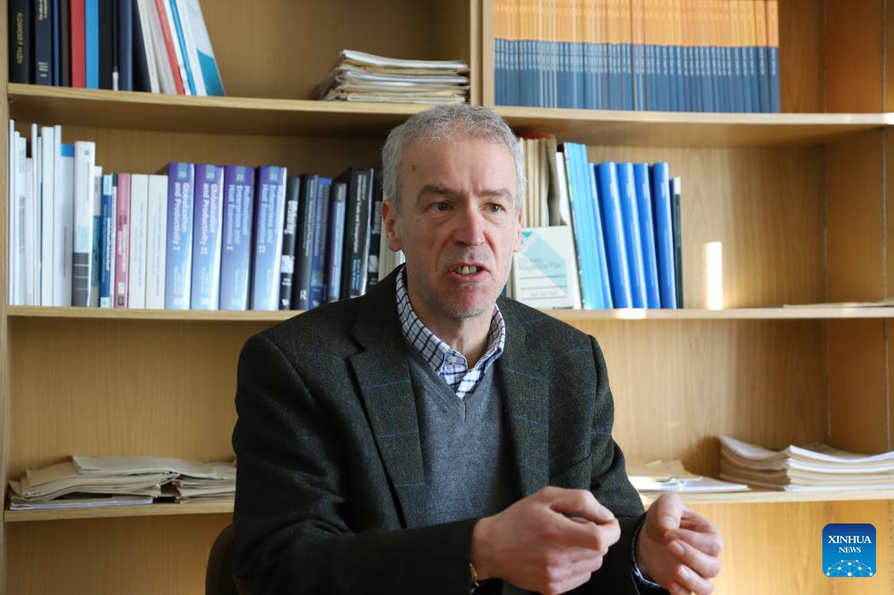 Holger Goerg, professor of International Economics at the University of Kiel, also the director of the International Trade and Investment Research Center at Kiel Institute, speaks during an interview with Xinhua in Kiel, Germany, March 19, 2025. (Xinhua/Liu Xiang)