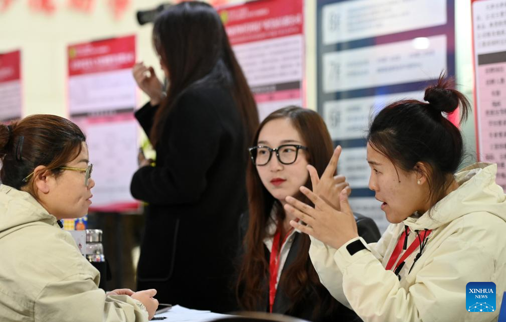 A recruiter communicates with a job seeker in sign language during a job fair in north China's Tianjin, March 26, 2025. A job fair was held for people with disabilities who graduated from higher education in Tianjin on Wednesday, providing over 100 positions to job seekers. (Xinhua/Zhao Zishuo)