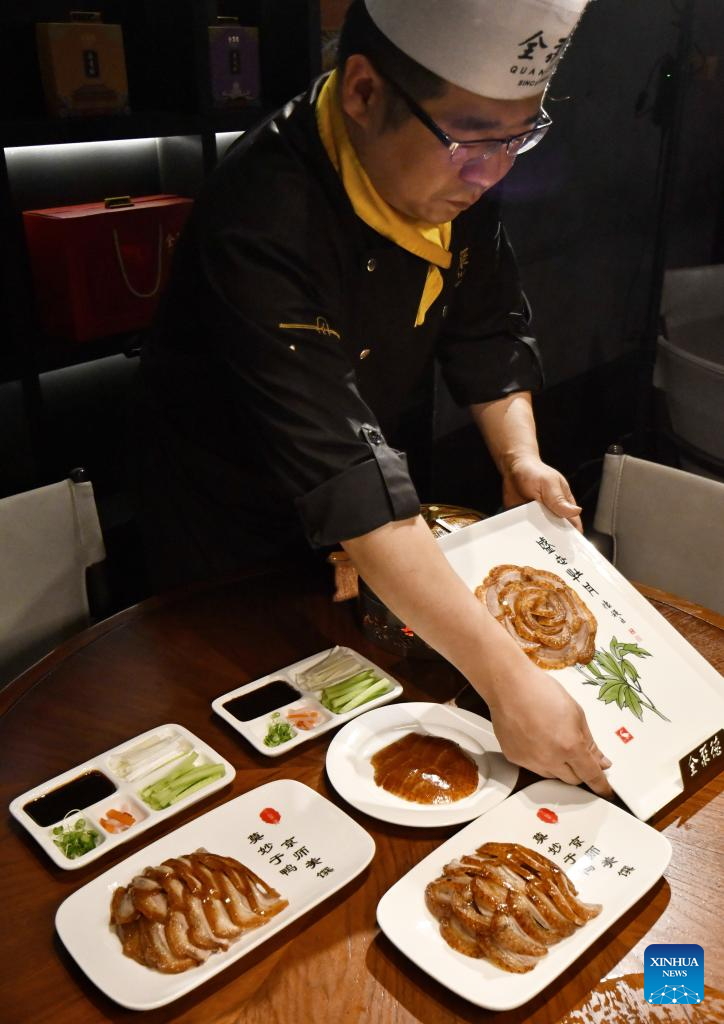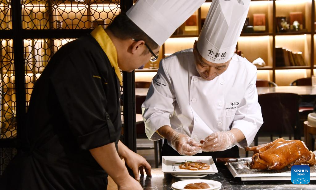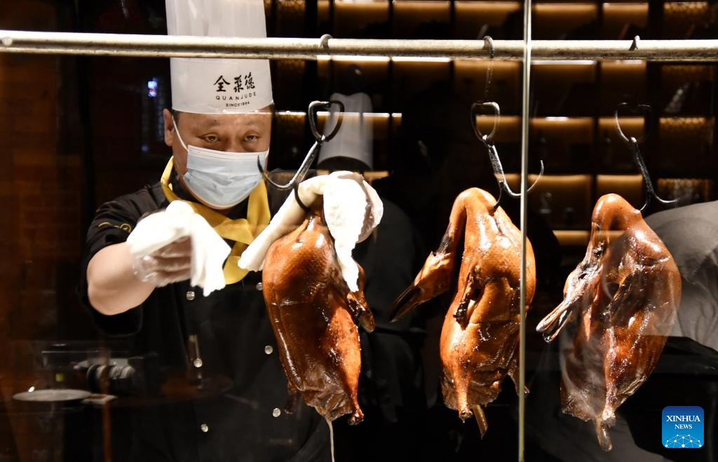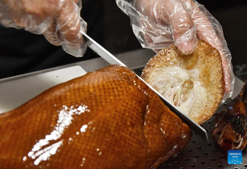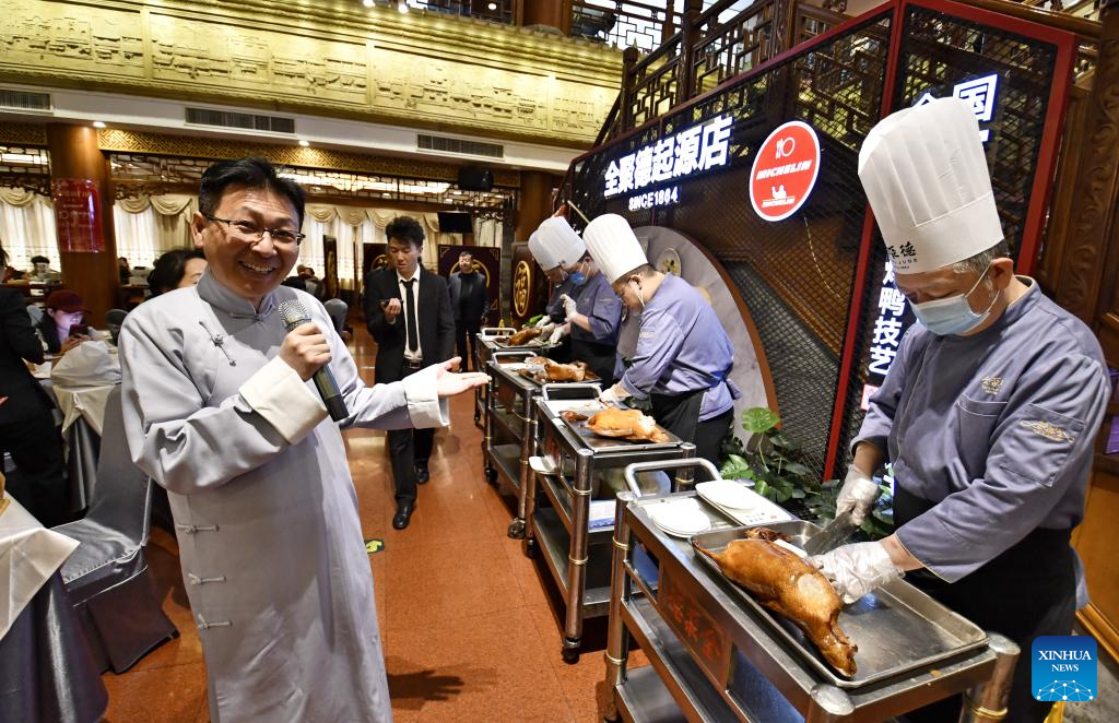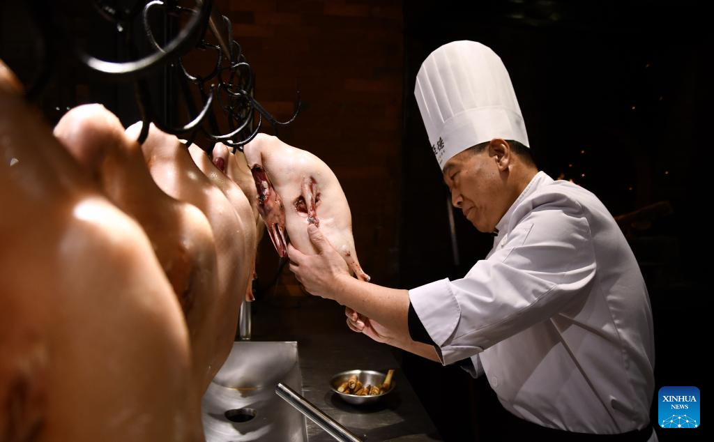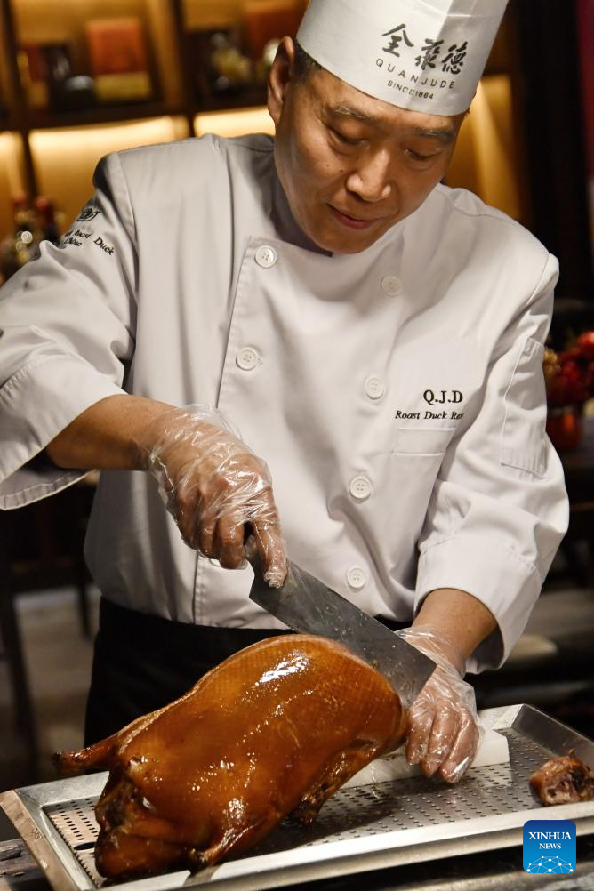 A chef prepares to slice Peking Duck for customers at the Hepingmen store of Quanjude in Beijing, capital of China, March 13, 2025. (Xinhua/Li Xin)
