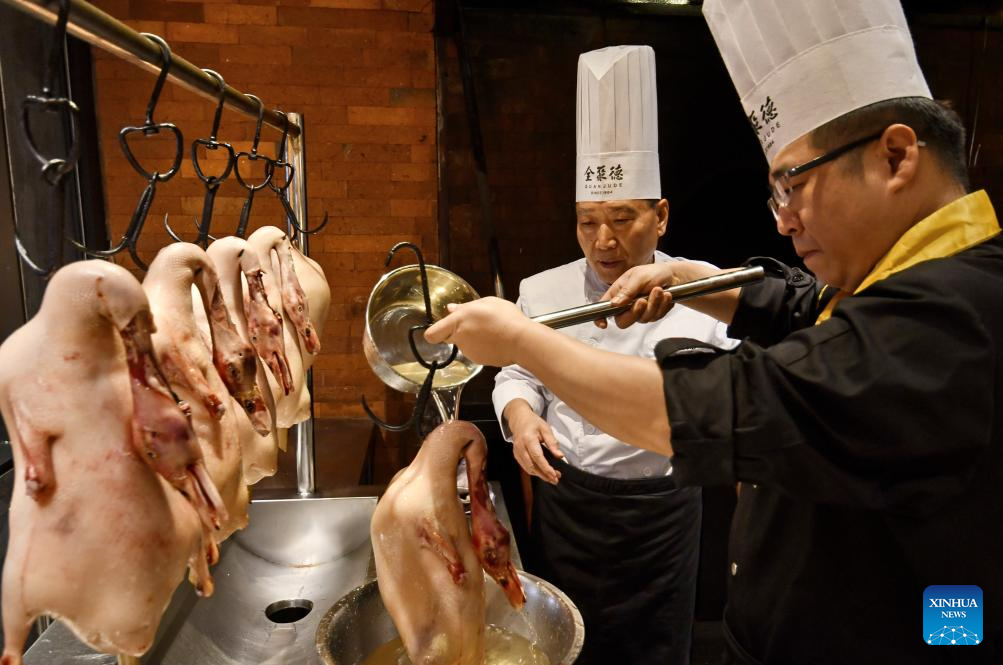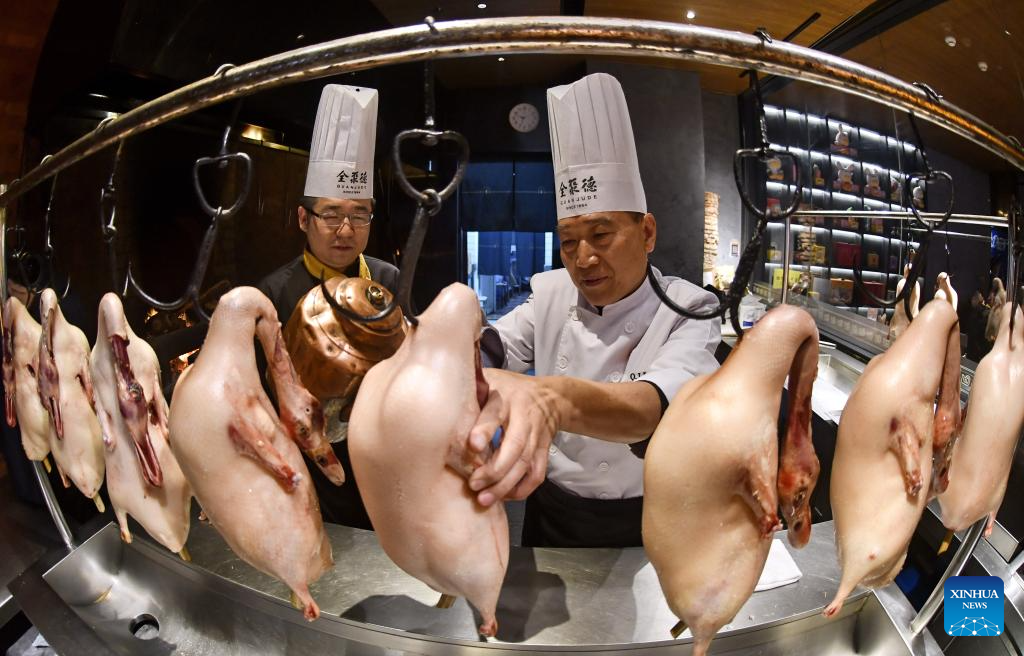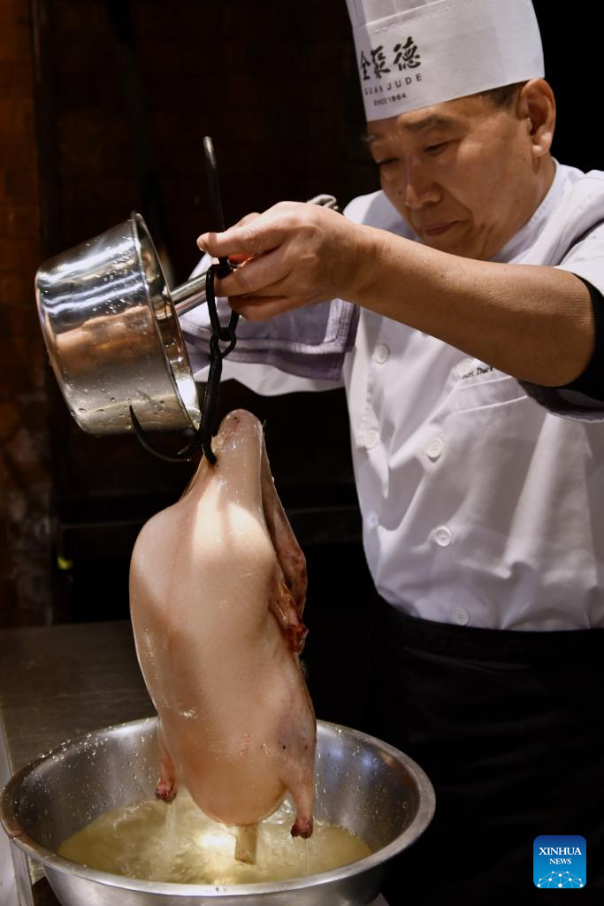 Wu Yubo prepares a duck at the Hepingmen store of Quanjude in Beijing, capital of China, March 13, 2025. (Xinhua/Li Xin)
