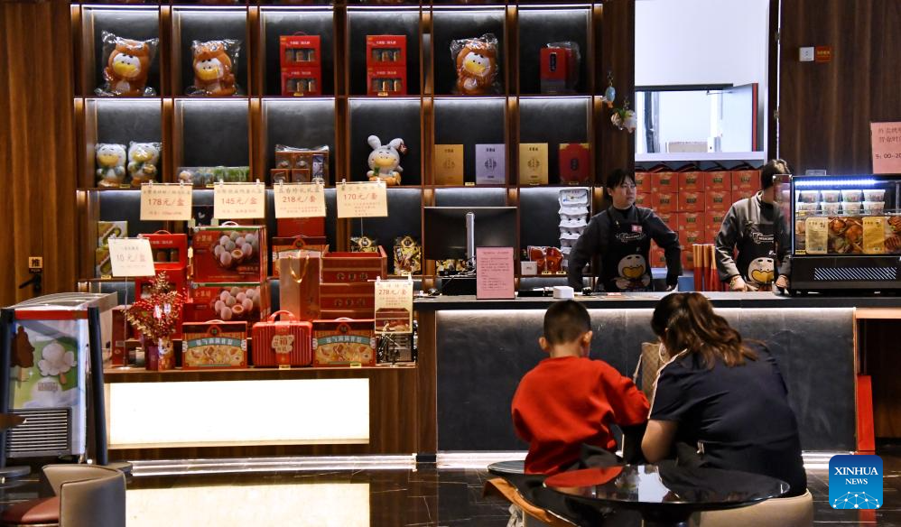 Customers look at cultural creative products of Quanjude at one of its experience stores on the Qianmen Street in Beijing, capital of China, March 25, 2025. (Xinhua/Li Xin)