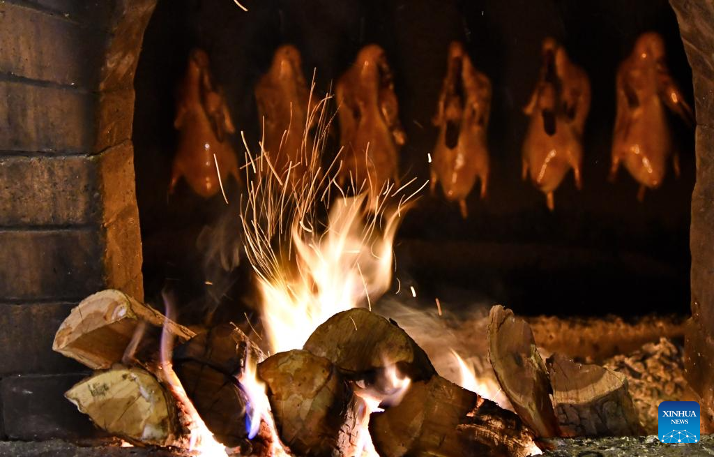 Ducks are being roasted in an oven at the Hepingmen store of Quanjude in Beijing, capital of China, March 13, 2025. (Xinhua/Li Xin)