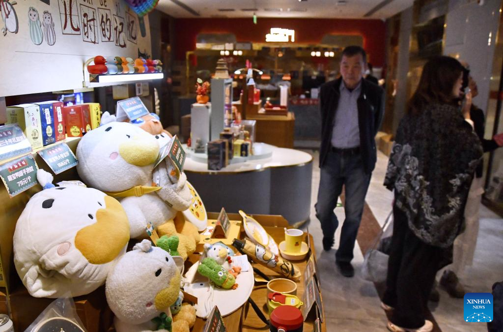 Cultural creative products are displayed at the Hepingmen store of Quanjude in Beijing, capital of China, March 13, 2025. (Xinhua/Li Xin)