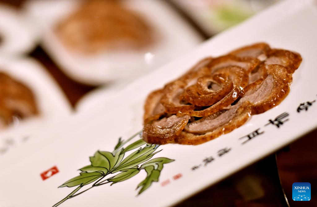 A plate of sliced Peking Duck is displayed at the Hepingmen store of Quanjude in Beijing, capital of China, March 13, 2025. (Xinhua/Li Xin)