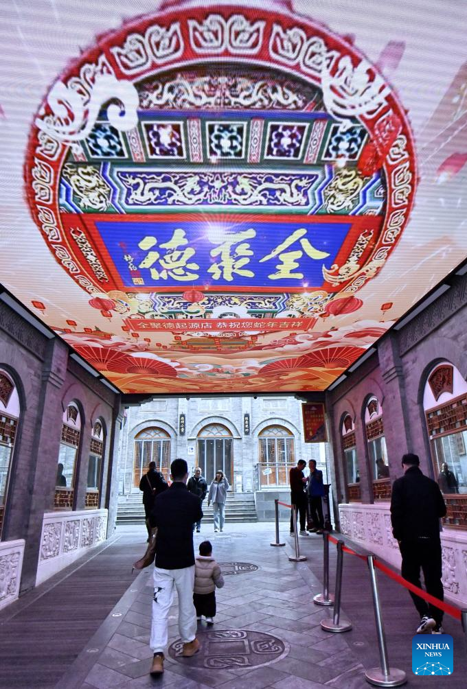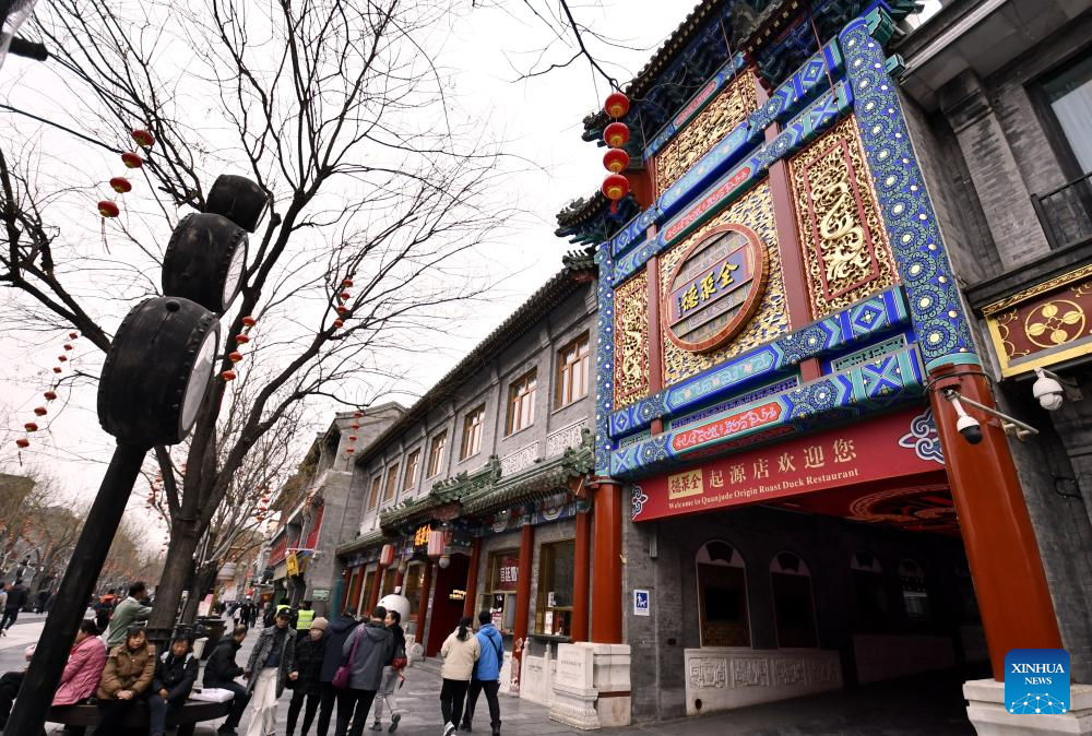 People walk to the first-ever store of Quanjude on the Qianmen Street in Beijing, capital of China, March 14, 2025. (Xinhua/Li Xin)