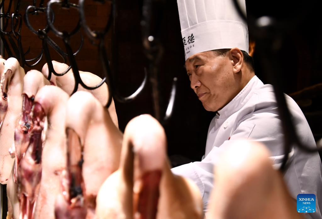 Wu Yubo checks the prepared duck at the Hepingmen store of Quanjude in Beijing, capital of China, March 13, 2025. (Xinhua/Li Xin)