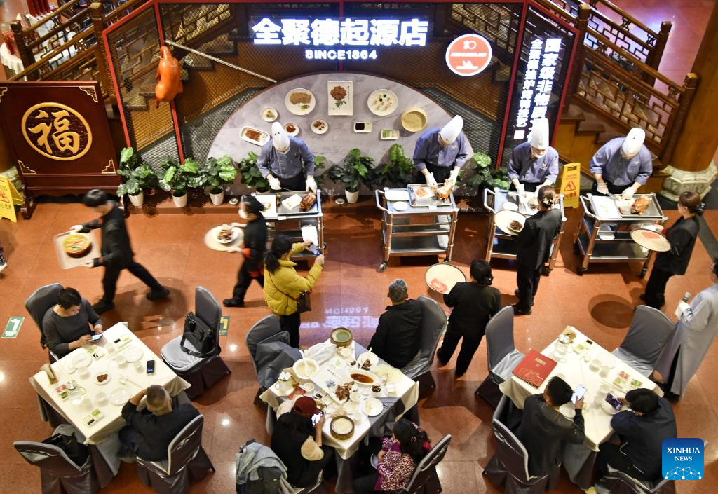 Customers have meals at the first-ever store of Quanjude on the Qianmen Street in Beijing, capital of China, March 25, 2025. (Xinhua/Li Xin)