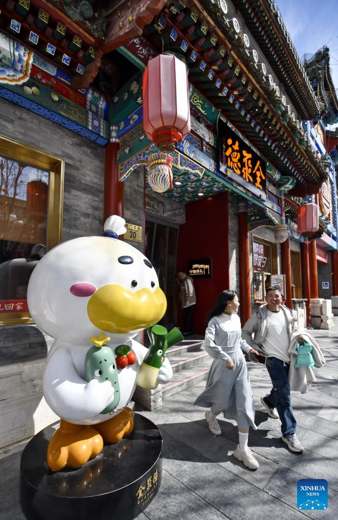 A mascot of Quanjude is displayed at the entrance of an experience store of Quanjude on the Qianmen Street in Beijing, capital of China, March 25, 2025. (Xinhua/Li Xin)