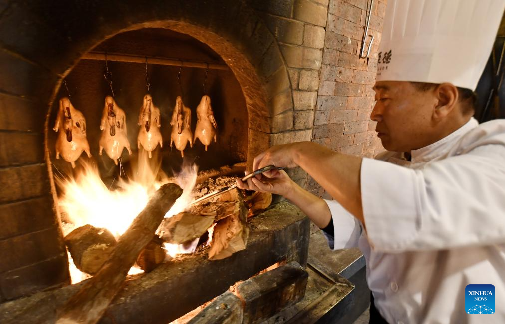Wu Yubo checks a roasted duck at the Hepingmen store of Quanjude in Beijing, capital of China, March 13, 2025. (Xinhua/Li Xin)