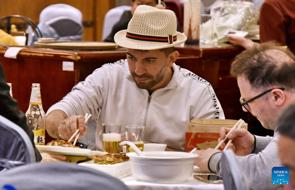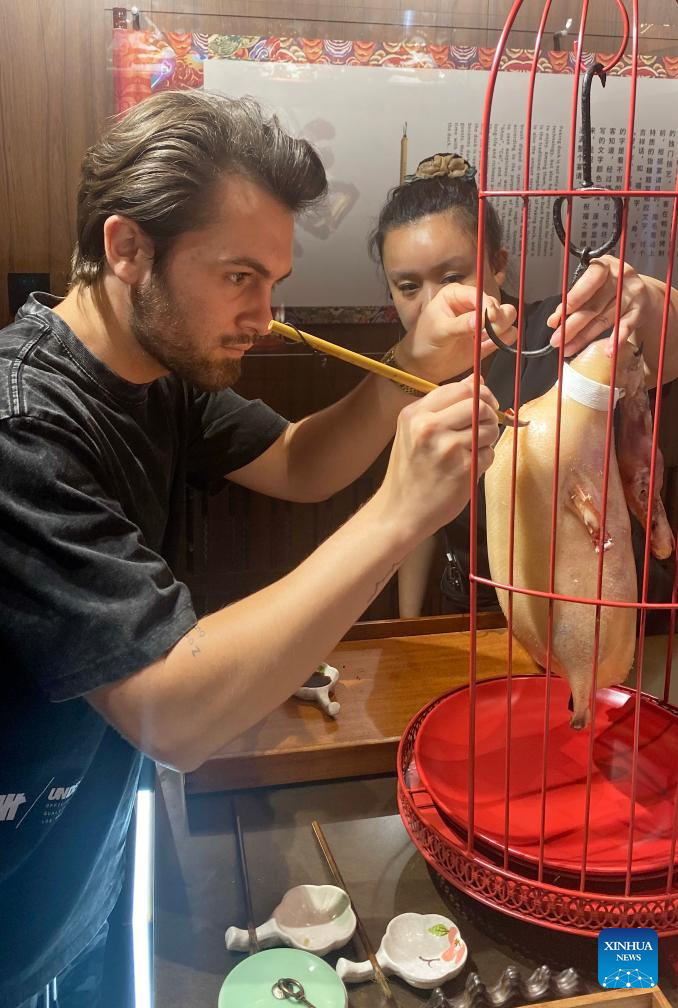 A foreign guest eats Peking Duck at the first-ever store of Quanjude on the Qianmen Street in Beijing, capital of China, March 25, 2025. (Xinhua/Li Xin)