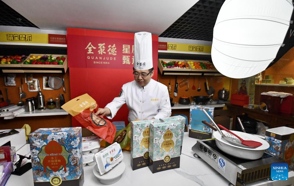 A chef prepares to promote Peking Duck through online streaming at the Hepingmen store of Quanjude in Beijing, capital of China, March 13, 2025. (Xinhua/Li Xin)