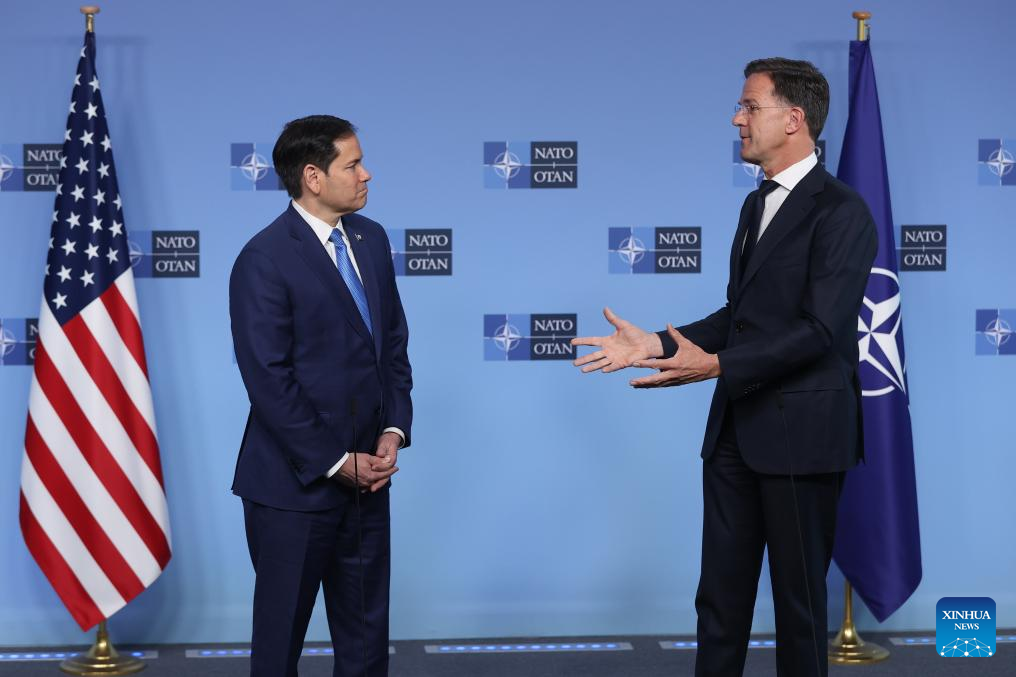 North Atlantic Treaty Organization (NATO) Secretary General Mark Rutte (R) and U.S. Secretary of State Marco Rubio meet the press during a NATO Foreign Ministers' meeting at the NATO headquarters in Brussels, Belgium, April 3, 2025. Rubio reaffirmed Washington's commitment to NATO during his first meeting with the alliance's foreign ministers, while emphasizing the need for more defense spending in Europe.(Xinhua/Zhao Dingzhe)
