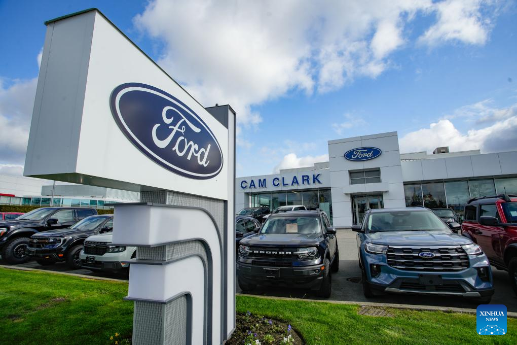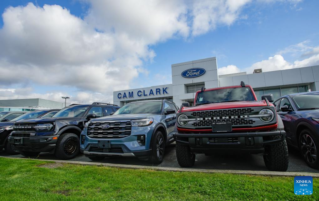 New vehicles are on display at a Ford dealership in Vancouver, British Columbia, Canada, on April 3, 2025. Canadian Prime Minister Mark Carney announced on Thursday Canada will be responding by matching the U.S. approach with 25 percent tariffs on all vehicles imported from the United States that are not compliant with the Canada-U.S.-Mexico Agreement (CUSMA). (Photo by Liang Sen/Xinhua)