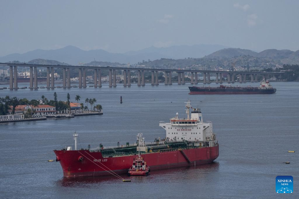 Aerial photo taken on April 3, 2025 shows an oil tanker anchored at a port in Rio de Janeiro, Brazil. Brazil's Congress on Wednesday passed a bill that allows the government to impose reciprocal trade and environmental measures against foreign restrictions, just hours after U.S. President Donald Trump announced a new 10 percent tariff on all Brazilian imports. (Xinhua/Wang Tiancong)