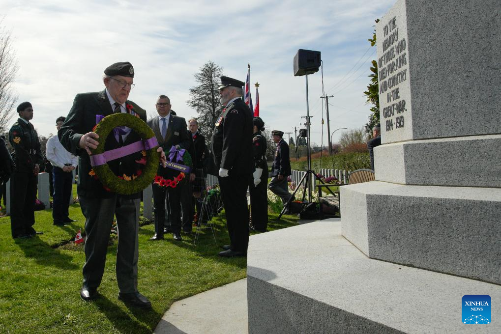 A veteran places a wreath at the cenotaph during a Vimy Ridge Day ceremony at the Mountain View Cemetery in Vancouver, British Columbia, Canada, April 5, 2025. About 300 army cadets, veterans, and government officials participated in a ceremony on Saturday ahead of Vimy Ridge Day to honour the Canadian soldiers who fought in the four-day Battle of Vimy Ridge during the First World War. The day is observed annually on April 9 and is also known as the National Day of Remembrance of the Battle of Vimy Ridge. (Photo by Liang Sen/Xinhua)