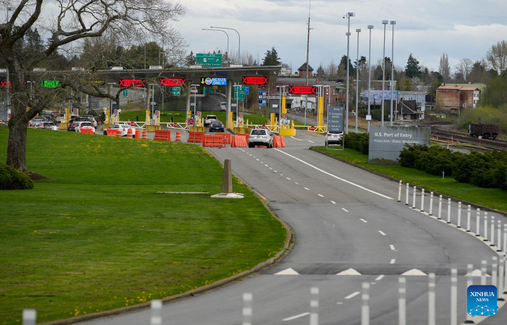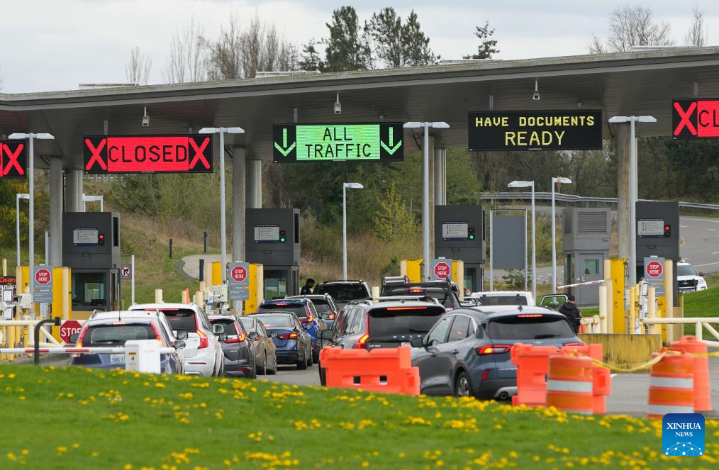 A car passes through the Peace Arch border crossing heading to the U.S. from Canada in Surrey, British Columbia, Canada, April 10, 2025. Canadian-resident return trips from the United States and U.S.-resident trips to Canada by automobile continued to decline, Statistics Canada said Thursday. Amid the tariff war with the United States, the Canadian government is encouraging Canadian consumers to shop and travel within Canada. (Photo by Liang Sen/Xinhua)