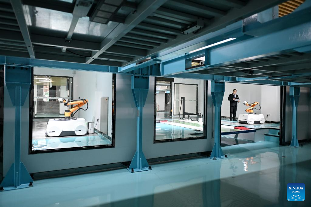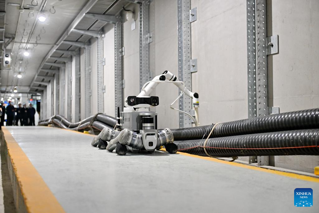 A robot conducts inspection work at a cable tunnel in Xiong'an New Area, north China's Hebei Province, April 15, 2025. In recent years, the local power sector of Hebei has been promoting power grids construction of Xiong'an New Area in accordance with the standards of first-tier cities in China. Under the concept of green, innovative and smart development, the construction of electrical substations would be integrated with urban landscape design, and many intelligent power projects have been finished. (Xinhua/Mu Yu)