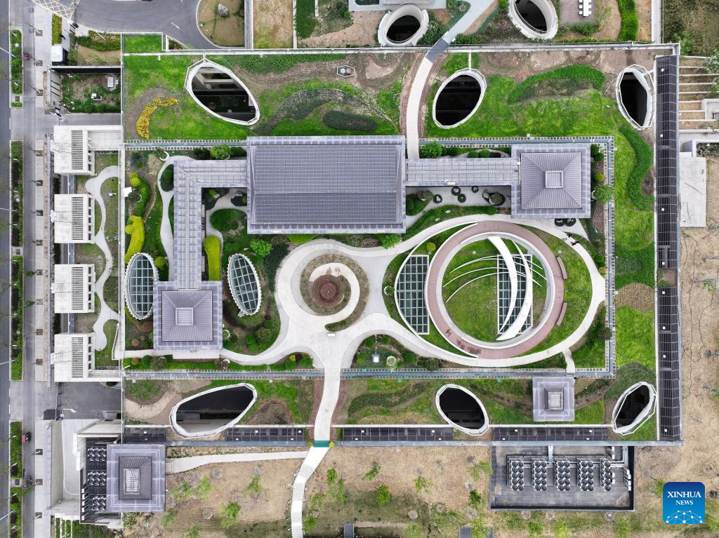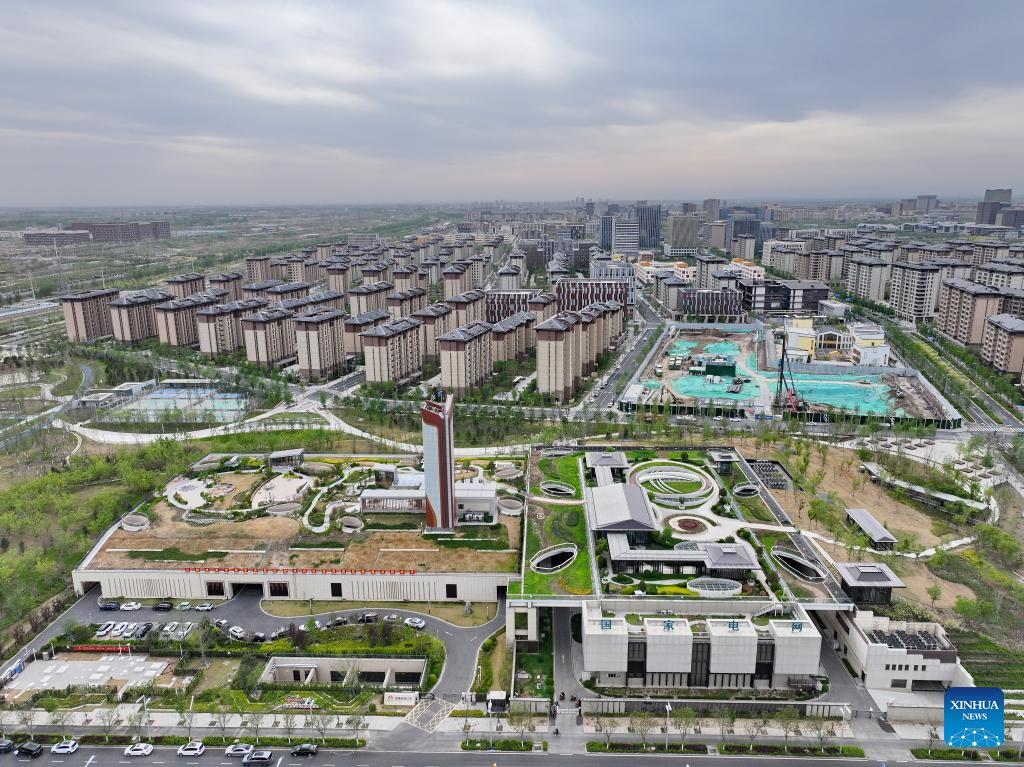 An aerial drone photo taken on April 15, 2025 shows an electrical substation in Xiong'an New Area, north China's Hebei Province. In recent years, the local power sector of Hebei has been promoting power grids construction of Xiong'an New Area in accordance with the standards of first-tier cities in China. Under the concept of green, innovative and smart development, the construction of electrical substations would be integrated with urban landscape design, and many intelligent power projects have been finished. (Xinhua/Mu Yu)