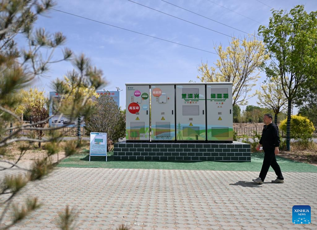 A man walks past a PEDF (Photovoltaic, Energy Storage, Direct current, Flexibility) system in Huangwan Village of Xiong'an New Area, north China's Hebei Province, April 15, 2025. In recent years, the local power sector of Hebei has been promoting power grids construction of Xiong'an New Area in accordance with the standards of first-tier cities in China. Under the concept of green, innovative and smart development, the construction of electrical substations would be integrated with urban landscape design, and many intelligent power projects have been finished. (Xinhua/Mu Yu)