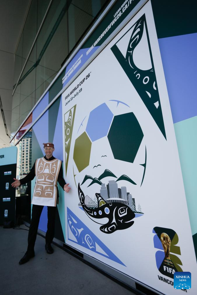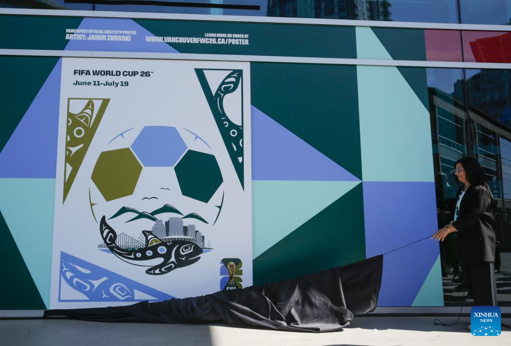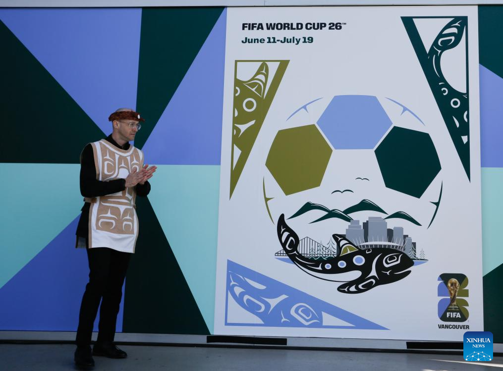 An official host city poster for the 2026 FIFA World Cup is unveiled during a press conference at BC Place in Vancouver, British Columbia, Canada, April 15, 2025. Vancouver unveiled the official host city poster for the 2026 FIFA World Cup on Tuesday, showcasing the integration of local characteristics with the spirit of the tournament. The 2026 FIFA World Cup will be jointly hosted by Canada, Mexico and the United States. As one of Canada's host cities, Vancouver is set to stage seven matches during the event. (Photo by Liang Sen/Xinhua)