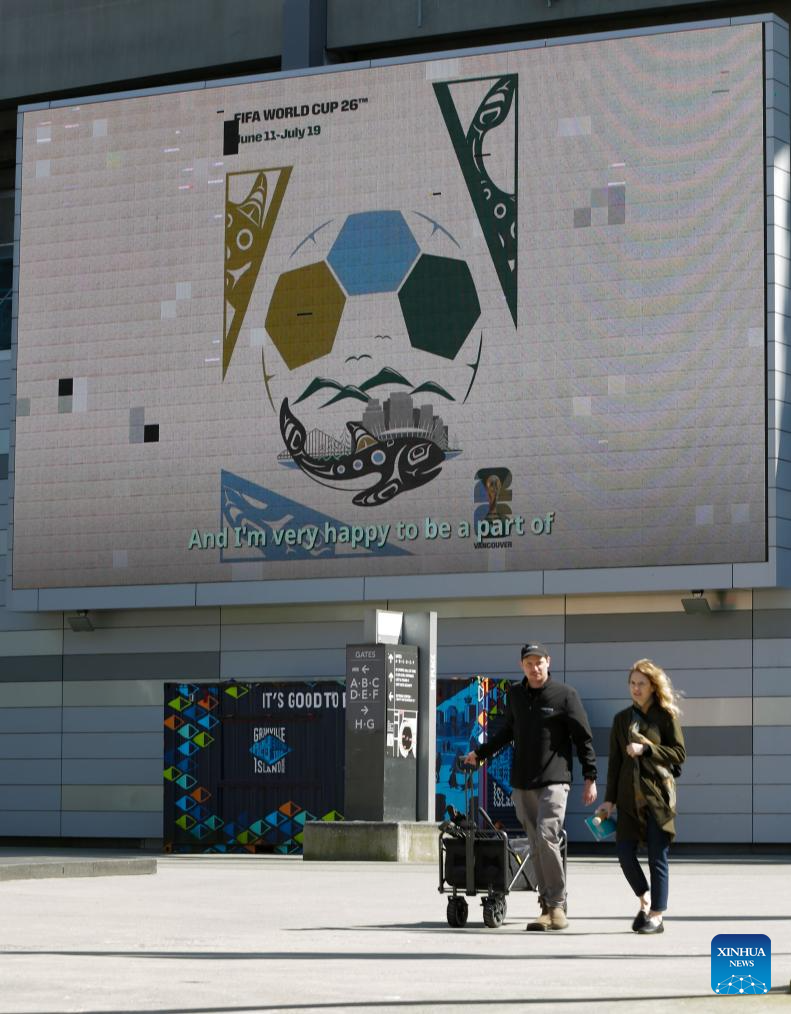 People walk past a big screen displaying the official host city poster for the 2026 FIFA World Cup at BC Place in Vancouver, British Columbia, Canada, April 15, 2025. Vancouver unveiled the official host city poster for the 2026 FIFA World Cup on Tuesday, showcasing the integration of local characteristics with the spirit of the tournament. The 2026 FIFA World Cup will be jointly hosted by Canada, Mexico and the United States. As one of Canada's host cities, Vancouver is set to stage seven matches during the event. (Photo by Liang Sen/Xinhua)