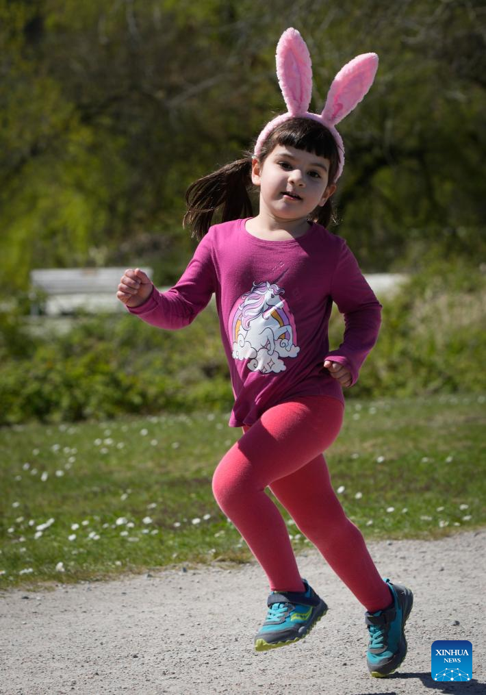 A girl participates in the Big Easter Run at Jericho Beach in Vancouver, British Columbia, Canada, April 19, 2025. The holiday-themed event draws hundreds of runners in bunny costumes to celebrate Easter, which falls on April 20 this year. (Photo by Liang Sen/Xinhua)