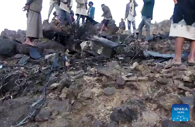 This video screenshot provided by the Houthi media outlets shows Yemeni villagers checking the wreckage of the U.S. MQ-9 drone in Sanaa province, Yemen, April 19, 2025. Yemen's Houthi group said Saturday it shot down another U.S.-made MQ-9 drone over Sanaa province in the past 24 hours. (Xinhua)